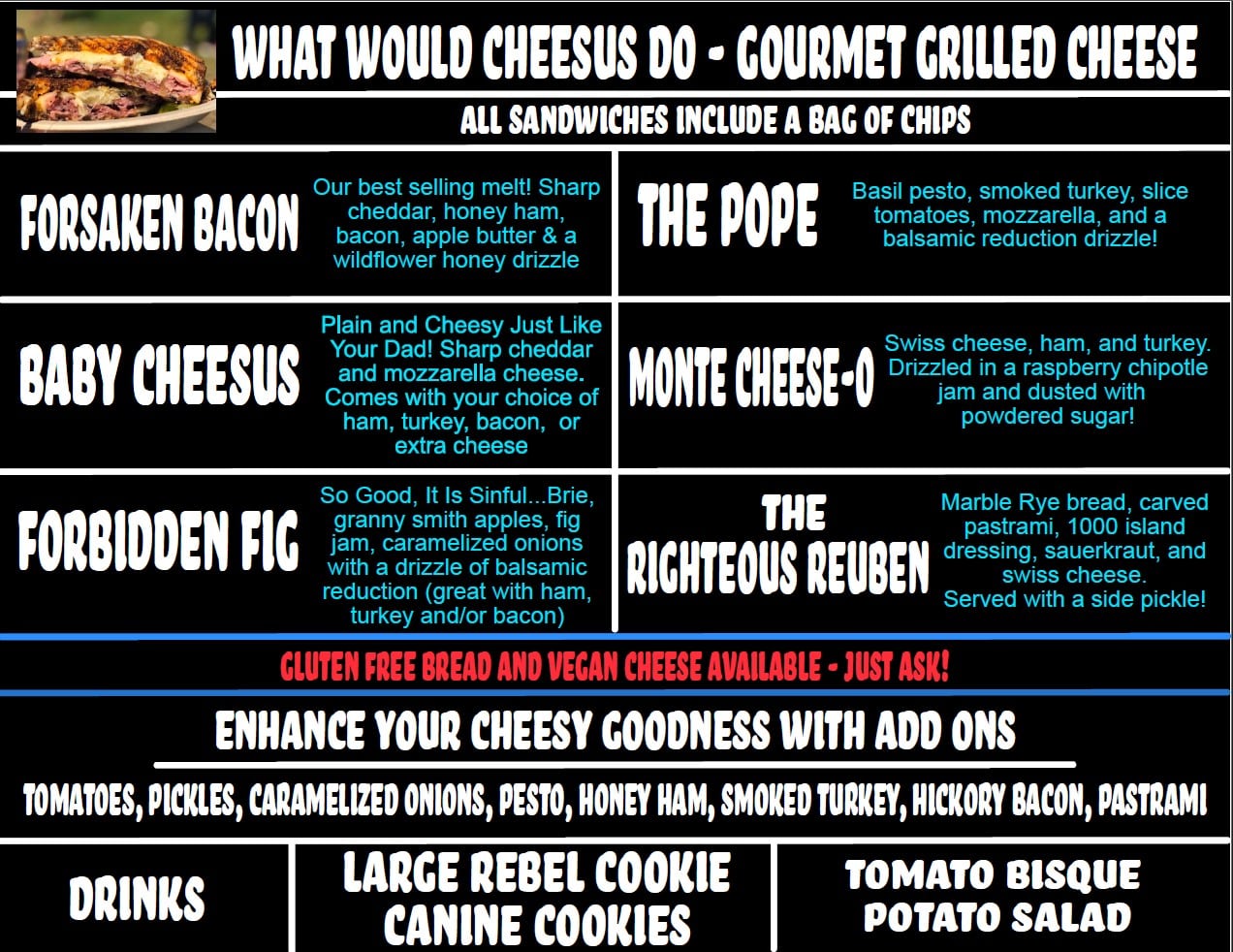 We believe in quality ingredients, the finest cheese with a mixture of seasonal ingredients always prepared with love and care.  What Would Cheesus Do was originally born while the founder was waiting for a post-hike meal from a food truck at a brewery near Denver, CO; at first blush, it seemed like a fun endeavor but a pipe dream.  It became her reality and this reality has continued to live on through new ownership. Tom and Jenny are committed to giving 110% in making this dream live on and continuing the Cheesus legacy.